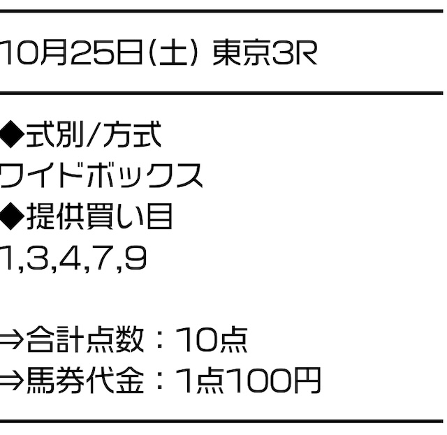 | 買い目点数 | 平均10点 | 平均13点 | 平均10点 | 平均4点 | 平均10点 | 平均10点 | 平均55.6点 | 平均3.8点 | 平均10点 | 平均7点 | 平均26.4点 | 平均10点 | 平均10点 | 平均10点 | 平均10.3点 | 平均10点 | 平均2~34点 | 平均7点 | 平均4~10点 | 平均10点 | 平均5点 | 平均10点 | 平均6点 | 平均3点 | 平均1~4点 | 平均9.9点 |