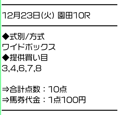 | 買い目点数 | 平均10点 | 平均10点 | 平均10.9点 | 平均4.4点 | 平均10点 | 平均3.3点 | 平均23.8点 | 平均10点 | 平均10点 | 平均10点 | 平均5.3点 | 平均10点 | 平均7.1点 | 平均29.7点 | 平均10点 | 平均10点 | 平均2~34点 | 平均7点 | 平均4~10点 | 平均10点 | 平均5点 | 平均10点 | 平均6点 | 平均3点 | 平均1~4点 | 平均10.3点 | 平均9.9点 | 平均55.8点 | 平均10点 | 平均10点 |