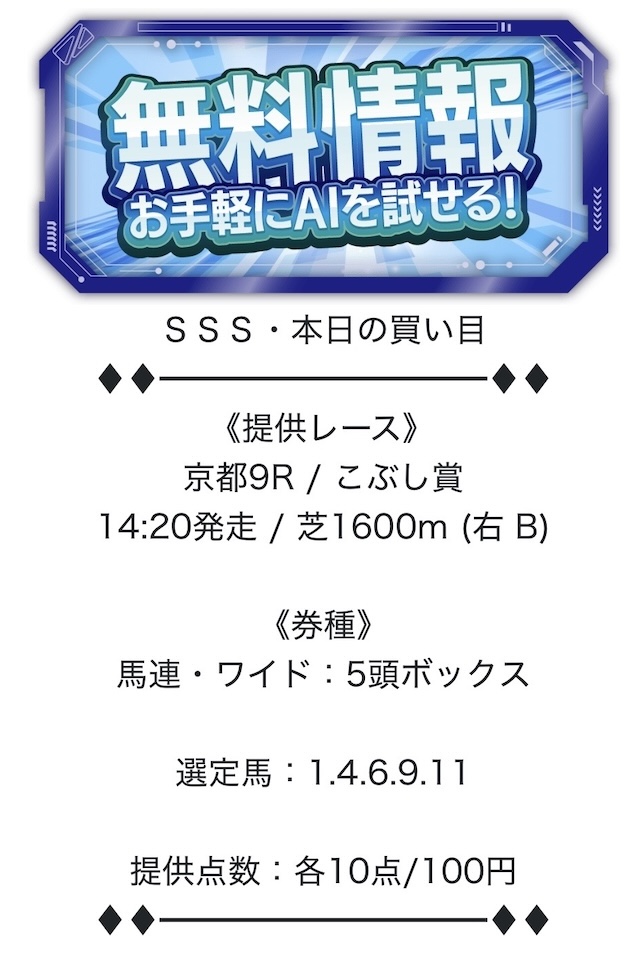 独自のAIが算出したデータを元に具体的な買い目を公開しています。