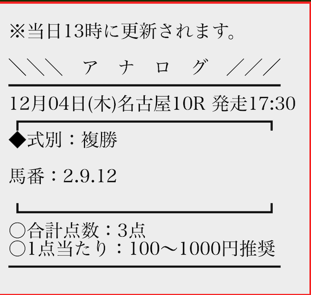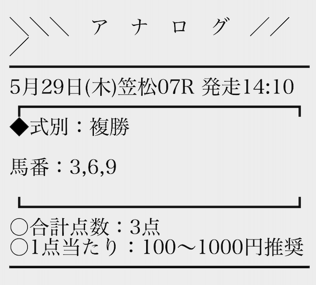 アナログが公開した買い目は中穴馬3頭を選出したワイド3頭ボックス。