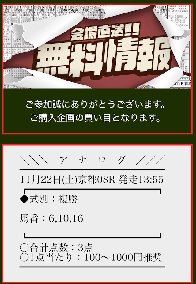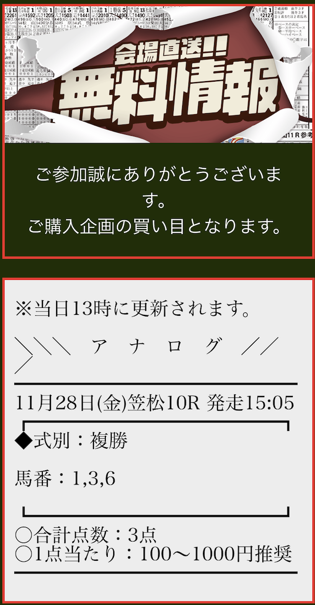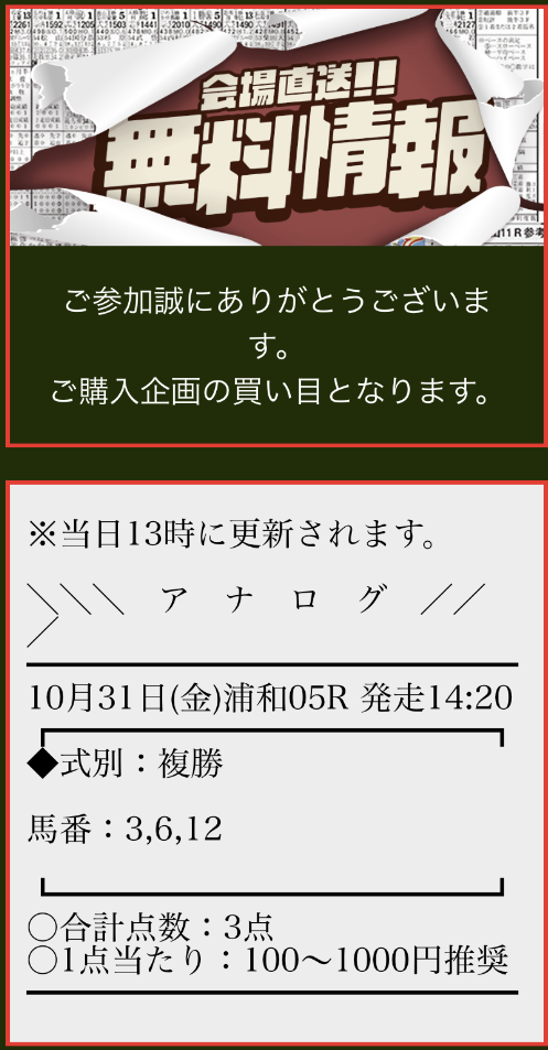 中長期的にお金を投じて馬券を購入していくので、アナログの予想に参加した実際の収支を”ノーリスク”で見ることができます。