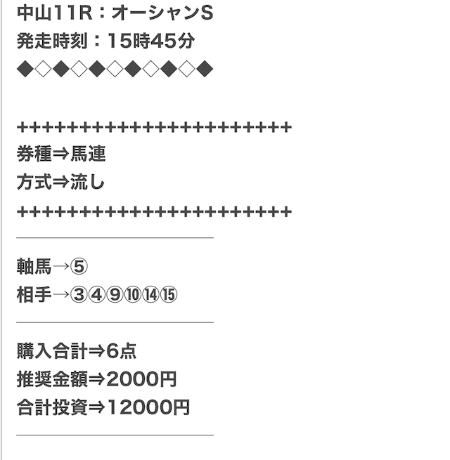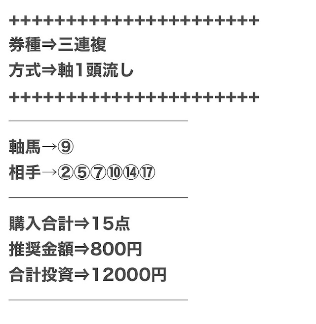 3番人気⑦シンティレーションを軸とした馬連流し計6点の買い目が公開されました。