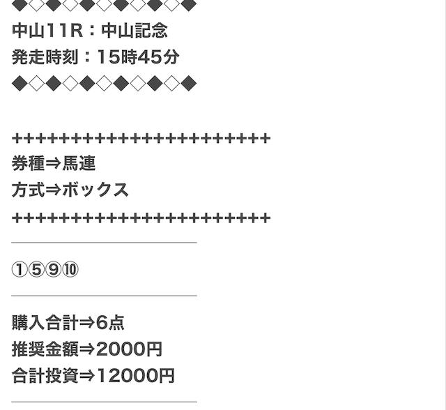 | プラン名 | 販売価格 | 券種 | 馬券代 |