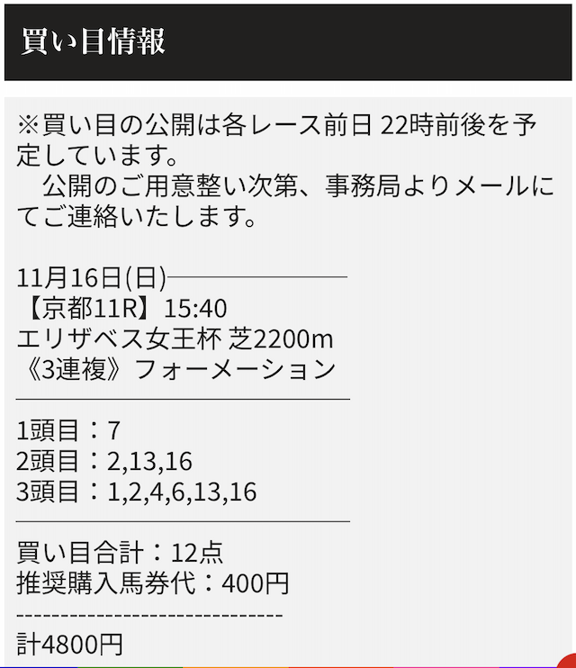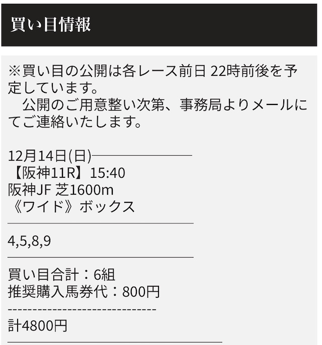 | 予想の確認方法 | 会員専用ページの[買い目確認] |
