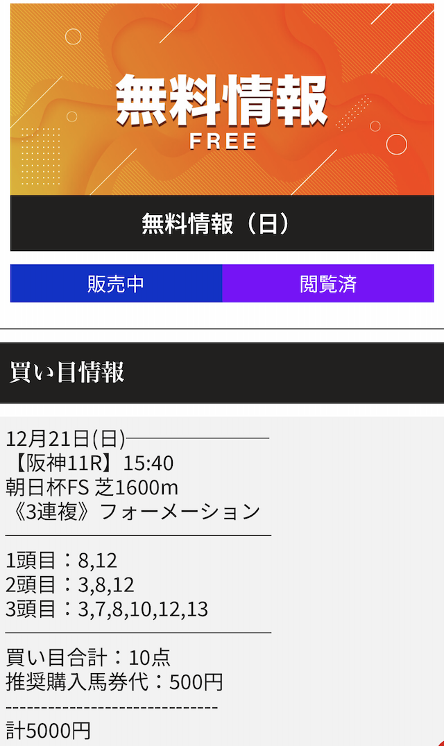 無料予想で一定の軍資金を稼いだ後は、有料予想に切り替えることでより短期的に大きく稼ぐことができるでしょう。