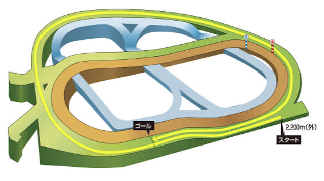 向こう正面は下り基調でペースが落ちにくく、3〜4コーナーからロングスパートになりやすいレイアウトです。
