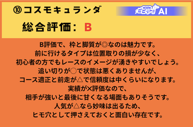 | 10 | コスモキュランダ | B | 【🤖】 | ◯ | △ | △ | ◎ | ◎ | ◯ | △ | ✕ |