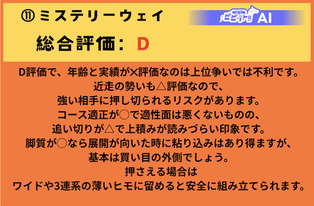 | 11 | ミステリーウェイ | D | 【🤖】 | △ | ◯ | △ | △ | ◯ | ✕ | △ | ✕ |