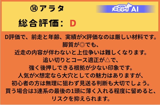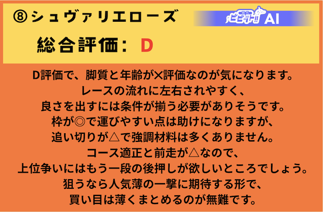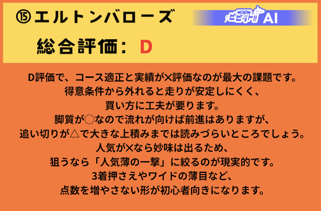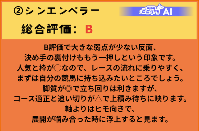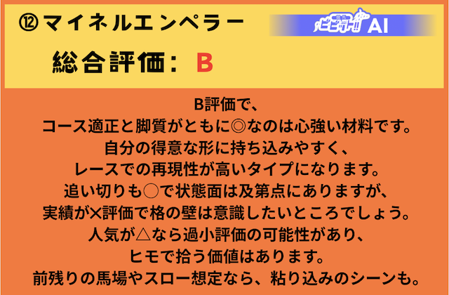 | 12 | マイネルエンペラー | B | 【🤖】 | ◯ | ◎ | △ | △ | ◎ | ◯ | ◯ | ✕ |