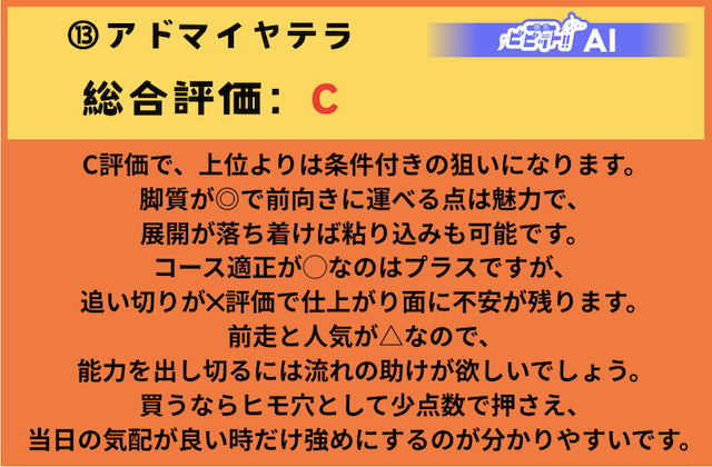 | 13 | アドマイヤテラ | C | 【🤖】 | ✕ | ◯ | △ | △ | ◎ | ◯ | △ | ✕ |