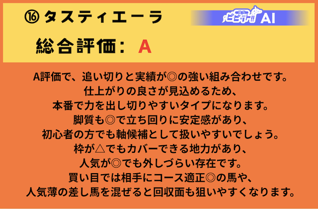 | 16 | タスティエーラ | A | 【🤖】 | ◎ | ◯ | ◎ | △ | ◎ | ◯ | ◯ | ◎ |