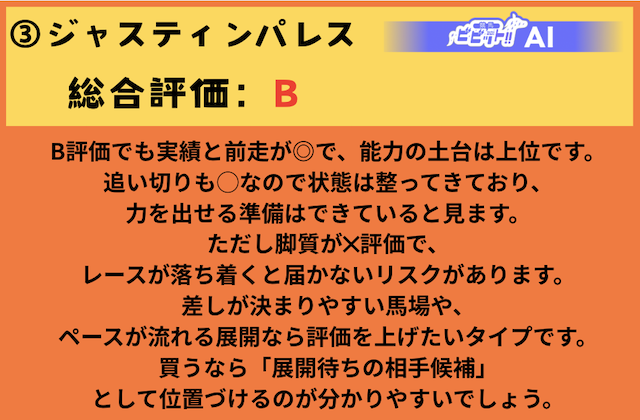| 3 | ジャスティンパレス | B | 【🤖】 | ◯ | ◯ | ◯ | △ | ✕ | △ | ◎ | ◎ |