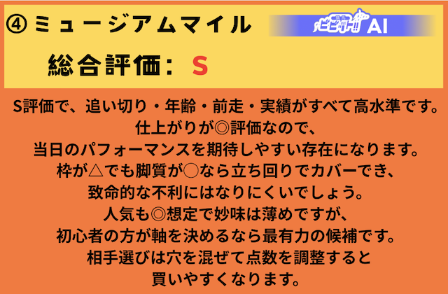 | 4 | ミュージアムマイル | S | 【🤖】 | ◎ | ◯ | ◎ | △ | ◯ | ◎ | ◎ | ◎ |