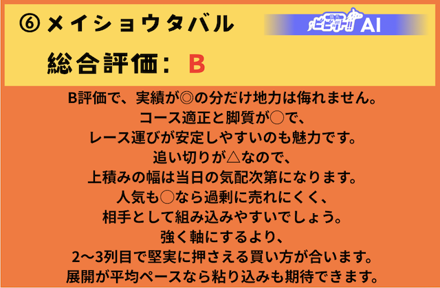 | 6 | メイショウタバル | B | 【🤖】 | △ | ◯ | ◯ | ◯ | ◯ | ◯ | ◯ | ◎ |