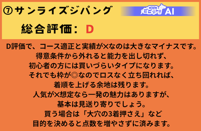 | 7 | サンライズジパング | D | 【🤖】 | △ | ✕ | ✕ | ◎ | △ | ◯ | △ | ✕ |