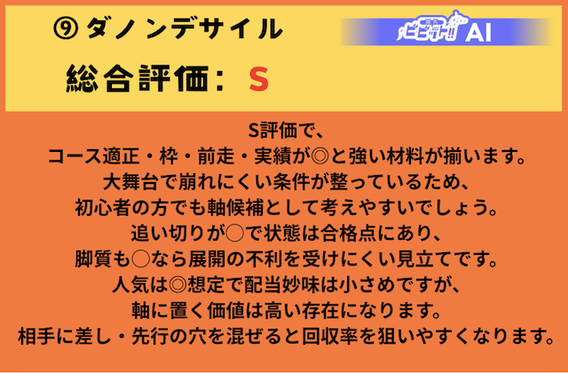 | 9 | ダノンデサイル | S | 【🤖】 | ◯ | ◎ | ◎ | ◎ | ◯ | ◯ | ◎ | ◎ |