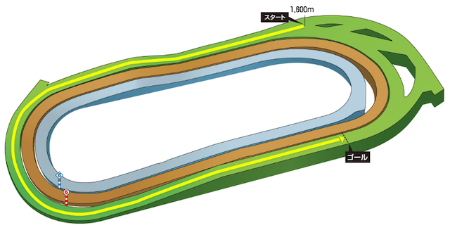 最初のコーナー(3コーナー)まで約540~550mと長く、序盤は無理なく隊列が整いやすいレイアウトです。