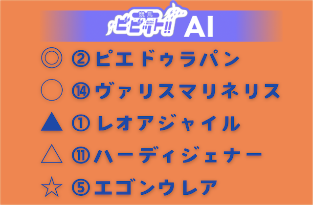 | 予想印 | ◎②ピエドゥラパン ◯⑭ヴァリスマリネリス ▲①レオアジャイル △⑪ハーディジェナー ☆⑤エゴンウレア |