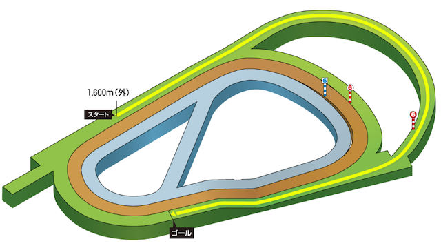阪神競馬場芝1600m(外回り)は、向こう正面のポケットからスタートし、最初のコーナーまで約440mと十分な距離があります。