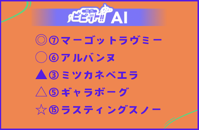 ⑦マーゴットラヴミーはレースの傾向に合致する点、⑥アルバンヌは追い切りと地力が評価され有力馬として選出されたようです。