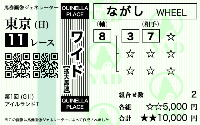 相手には同じく有力馬としてご紹介した⑦や穴馬としてご紹介した③に加え、上位人気馬+中穴馬を4頭絡めました。