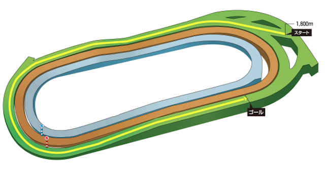 発走直後は2コーナーを斜めに横切って向こう正面へ合流し、3コーナーまで約750mと長いため序盤は落ち着きやすいです。