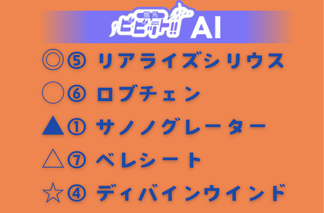| 予想印 | ◎⑤ リアライズシリウス ◯⑥ ロブチェン ▲① サノノグレーター △⑦ ベレシート ☆④ ディバインウインド |