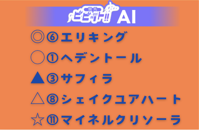 | 予想印 | ◎⑥エリキング ◯①ヘデントール ▲③サフィラ △⑧シェイクユアハート ☆⑪マイネルクリソーラ |