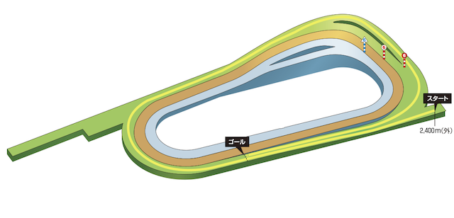 京都競馬場芝2400mは右回りの外回りを使用するコース。