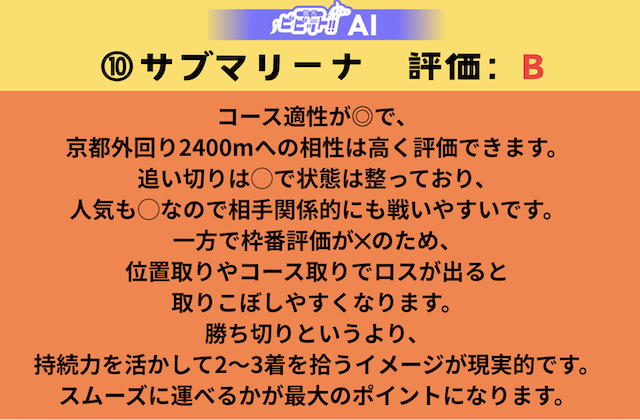 | 10 | サブマリーナ | B | 【🤖】 | ◯ | ◎ | ◯ | ✕ | ◯ | ◯ | △ |