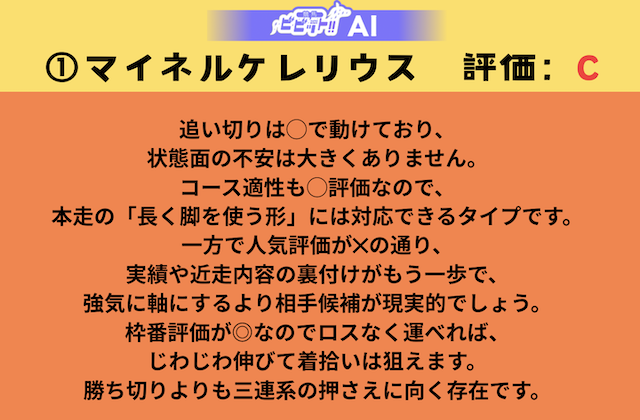 | 1 | マイネルケレリウス | C | 【🤖】 | ◯ | ◯ | ✕ | ◎ | ◯ | △ | △ |