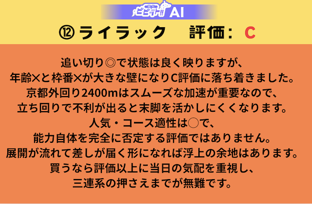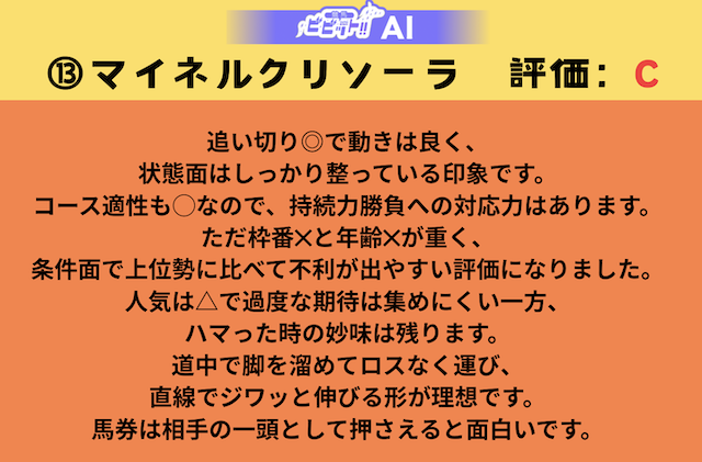 | 13 | マイネルクリソーラ | C | 【🤖】 | ◎ | ◯ | △ | ✕ | ◯ | ✕ | △ |