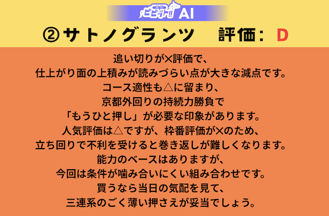 | 2 | サトノグランツ | D | 【🤖】 | ✕ | △ | △ | ✕ | ◯ | △ | △ |