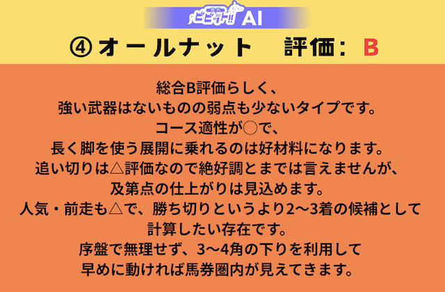 | 4 | 4 | オールナット | 7 | 16.8 | 牡5 | 57.5 | 西村 淳也 | 【鳴尾記念(GIII)】10位 |