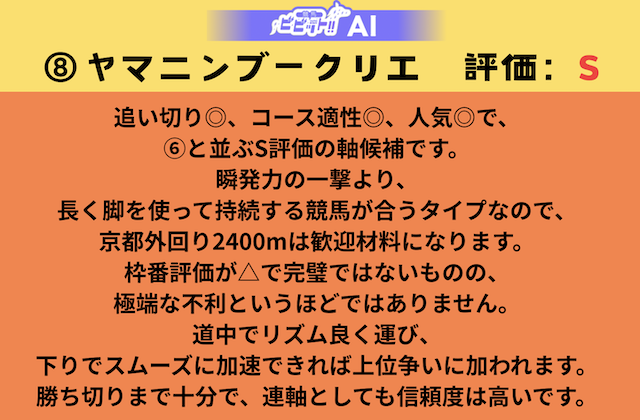 | 8 | ヤマニンブークリエ | S | 【🤖】 | ◎ | ◎ | ◎ | △ | ◯ | ◎ | ◯ |