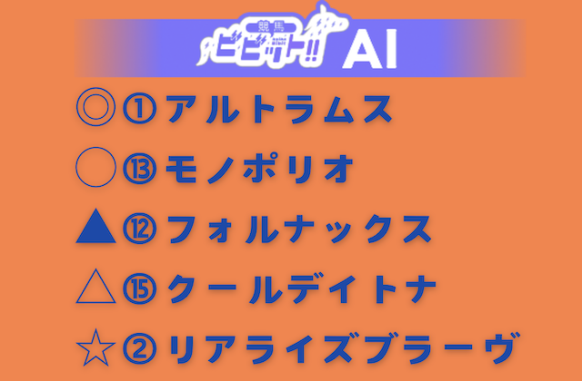 | 予想印 | ◎①アルトラムス ◯⑬モノポリオ ▲⑫フォルナックス △⑮クールデイトナ ☆②リアライズブラーヴ |