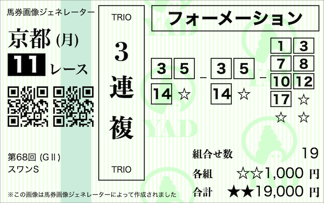 3連複フォーメーション計19点の買い目で