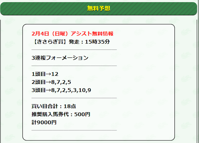 無料予想の回収率が素晴らしいサイトです。アシストと同じく3連複を公開しているサイトと比較してもかなり稼げます。