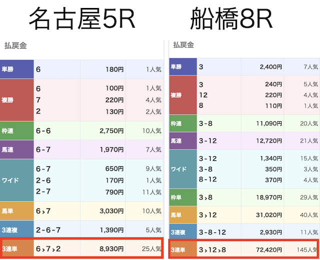 名古屋5Rでは3連単に89.3倍の配当が付き107,160円、船橋8Rでは3連単に724.2倍の配当が付き434,520円の払戻金を獲得!