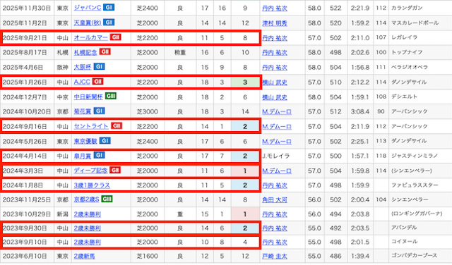中山競馬場では8回中6回馬券に絡んでおり、この競馬場との相性が良いことがわかります。