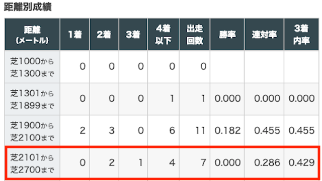 距離別成績で見ても、有馬記念と同等の中長距離の成績はよくありません。