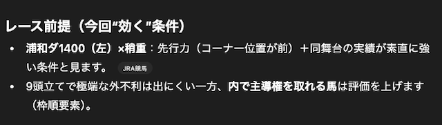 | プロンプト例 | # 条件分岐 以下の条件ごとに予想を出してください。 ・良馬場の場合 ・道悪になった場合 ・ハイペース想定の場合それぞれ、評価が上がる馬・下がる馬と 理由を説明してください。 |