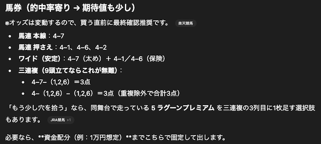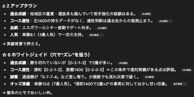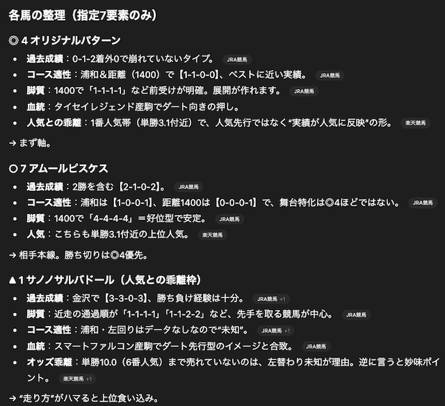 このプロンプトを送ることで、「なぜこの馬を買うのか」が可視化され、最終的な馬券判断が格段にしやすくなります。