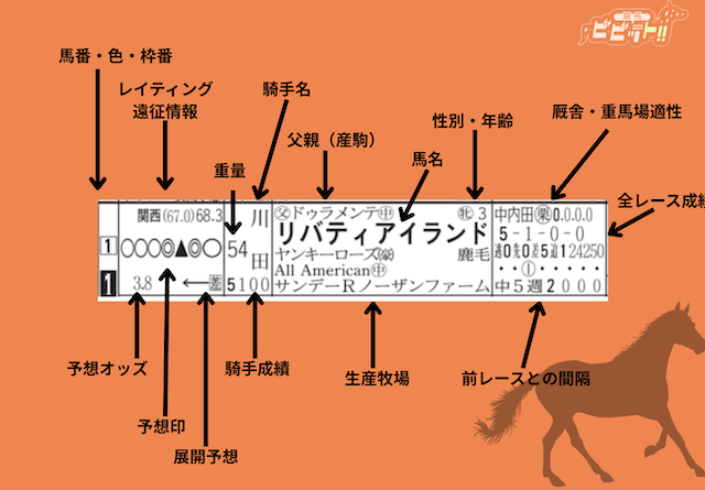 これらの情報を馬柱ひとつでまとめて把握できるため、予想に必要な要素の大部分をカバーすることが可能。