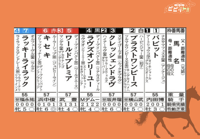こちらの欄では、出走馬の血統背景や距離適性に加え、どの騎手が騎乗するのかまで一目で確認することができます。