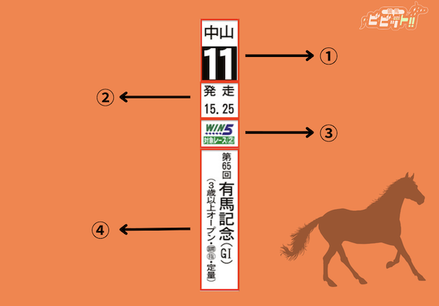 | ① | 開催場とレース番号 | どの競馬場で開催されるか。 何レースを対象とした内容なのか |