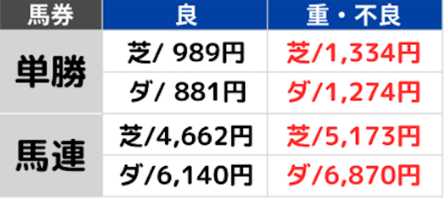 ご覧の通り、重・不良馬場になると芝・ダートどちらでも平均配当が上昇。