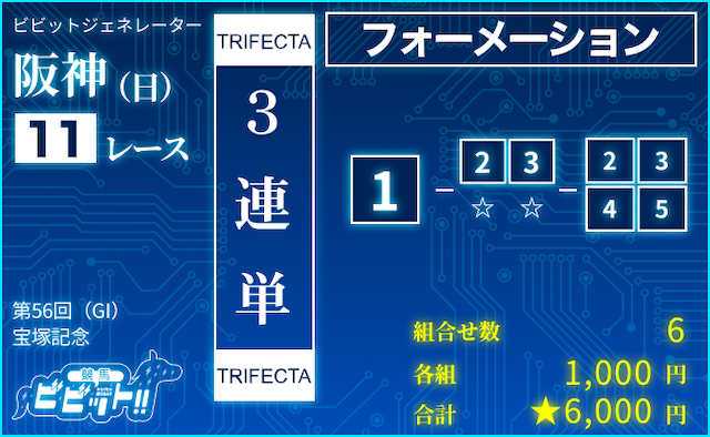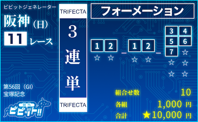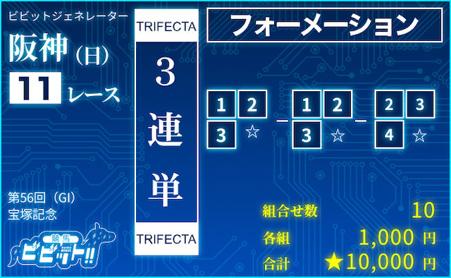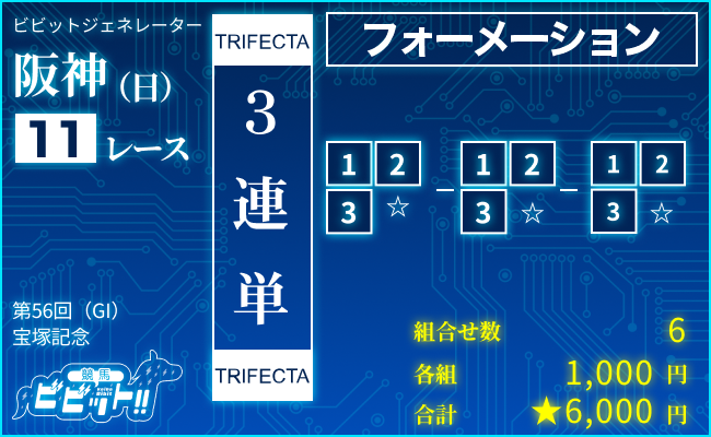 そこまで工数をかけることなく勝負できるので、三連単フォーメーション1000円で勝負するのに向いていると言えます。