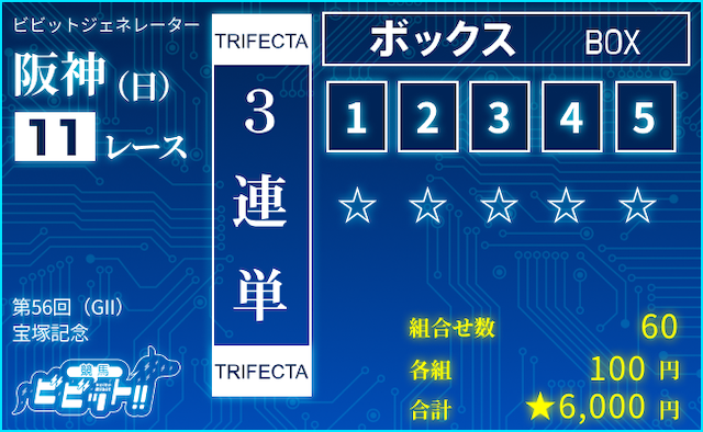 画像にもある通り、3連単5頭ボックスの買い目点数は60点。