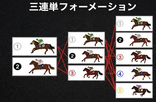 三連単フォーメーションとは、1着~3着に入る馬をそれぞれ1頭以上選択しそのすべての組み合わせを購入する買い方のこと。